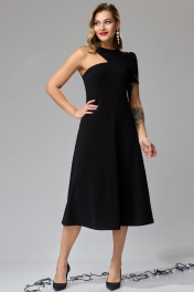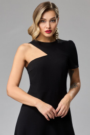 Платье А-образного силуэта из трикотажной ткани имитирующей креп. Платье отрезное по линии талии. Верхняя часть переда с талиевыми и нагрудными вытачками. В верхней правой части фигурный вырез. Рукав левый втачной с о сборкой по окату. Спинка со средним швом и талиевыми вытачками в верхней части. Вверху среднего шва потайная молния. Нижняя часть платья расширенная. Длина платья - 117 см, длина рукава - 24 см. Рост 164
