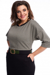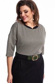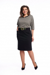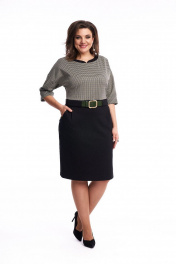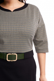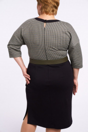 Платье женское, приталенного силуэта, выполнено из двух видов трикотажной ткани. Вырез горловины овальный с притачной фигурной планкой из контрастной ткани, по спинке выполнен разрез и застёжка на 2 воздушные петли и пуговицы. По переду расположены нагрудные вытачки. Платье отрезное по линии талии с притачным поясом. На поясе переда расположена широкая шлёвка для декоративного ремня (ремень не идет в комплекте). В нижней передней части платья имеются боковые карманы и складки. В нижней задней части платья - талиевые вытачки. Спинка со средним швом, в котором имеется потайная тесьма-молния. В левом боковом шве имеется разрез. Линия плеча спущена, рукав втачной. В качестве декора используется готовый ремень. Платье может использоваться как для повседневной носки, так и для работы в офисе, в школе, удобное, силуэт подчёркивает достоинства фигуры, за счёт качеств трикотажа, приятное на ощупь и не сковывает движение. Длина платья по спинке 101 см, длина рукава от горловины 48 см Параметры модели в 50 размере: ОГ 100 см, ОБ 111 см; параметры в 52 размере ОГ 104см, ОБ 115см; параметры в 54 размере ОГ 108см, ОБ 119см