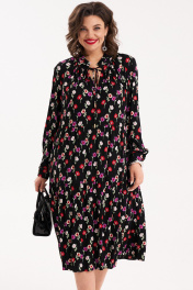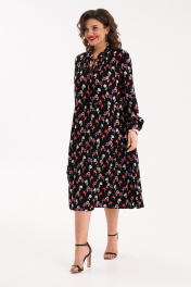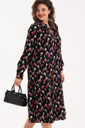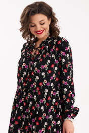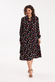 Женское платье свободного силуэта с оборками по переду и спинке. По горловине стойка с рюшей. Из под стойки - сборка, по центру переда - разрез. По спинке кокетка с мягкими складками. Рукав втачной, длинный, с притачной манжетой по низу, застегивающийся на петли и пуговицы. Длина спинки - 114 см,длина рукава - 62 см. 50 размер: ОГ- 116 см, ОТ - 108 см; 52 размер: ОТ - 120 см, ОТ- 112 см; 54 размер: ОГ- 124 см, ОТ - 116 см.
