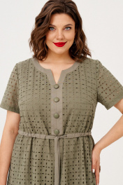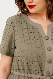 Легкое летнее платье свободногосилуэта выполнено из хлопка с шитьем и однотонного хлопка, на подкладке. По линии талии кулиска, которой можно подчнуть линию талии. По переду планки фигурной формы, имметирующая застежку с пуговицами. По низу полочки и спинки оборка. Рукав втачной, короткий.Параметры на 50 размер: ОГ 108 см, ОТ 114 см, ОБ 128 см, длина изделия 112 см, длина рукава 23 см, ширина рукава 37 см.Параметры на 52 размер: ОГ 112 см, ОТ 118 см, ОБ 132 см, длина изделия 112 см, длина рукава 23 см, ширина рукава 39 см. Параметры на 54 размер: ОГ 116 см, ОТ 122 см, ОБ 136 см, длина изделия 112 см, длина рукава 23 см, ширина рукава 41 см.