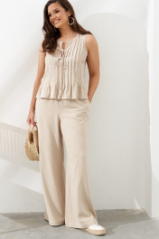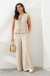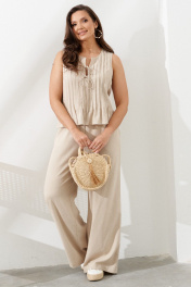 * Костюм из смесового льна двухпредметный (блузка, брюки). * Блузка полуприлегающего силуэта длиной 56 см. * Перед с вертикальными защипами, разрезом от горловины и завязками. * Вырез горловины круглый. * Брюки прямые длиной 110 см (по боковому шву), 77 см (по шаговому шву). * Пояс брюк отрезной на резинке. * Боковые швы с наклонными карманами