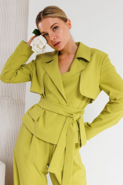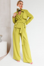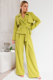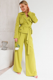 Жакет прямого силуэта,с воротником пиджачного типа.По переду и спинке отлетные кокетки.По переду в области талии декоративные клапаны.Жакет на хлопковой подкладке с поясом.Брюки палаццо свободного кроя с притачным поясом на резинеке.В боковых шах прорезные карманы.