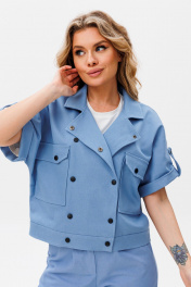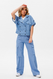 Жакет женский двубортный прямого силуэта с цельнокроеным рукавом.Рукав короткий с отложной манжетой на пате.По переду накладные карманы с клапаном.Спинка со швом. Брюки прямого силуэта,на притачном поясе с застежкой на тесьму-молнию по переду.По боковым угловые карманы.По левому и правому полотнищу брюк накладной карман "Книга" с клапаном