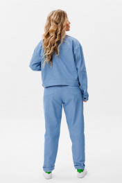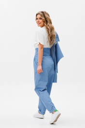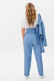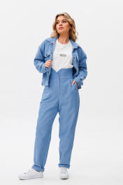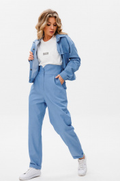 Джинсовый Жакет свободного силуэта с застежкой по переду на кнопки.Воротник отложной.По переду отрезные кокетки, накладные карманы с клапанами.По спинке кокетка и рельефы.Рукав двухшовный с притачной манжетой на кнопках.Низ жакета на притачном поясе. Брюки "Бананы" свободного силуэта с высокой посадкой. Пояс притачной широкий. По переду действующие боковые карманы. Сзади накладные карманы. Застежка на тесьму молнию и пришивную кнопку спереди.