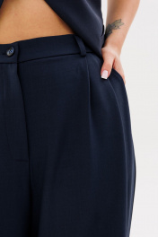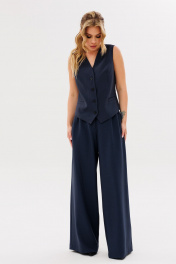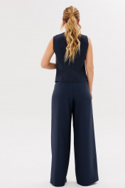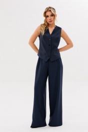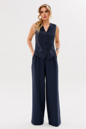 Жилет полуприлегающего силуэта, на подкладке. По переду рельефа карманы "листочки", застёжка на петли-пуговицы. По спинке вытачки .Брюки женские,свободного силуэта,на поясе со шлевками.Застежка на молнию и пуговицу.По переду заложены складки.По бокам действующие угловые карманы.