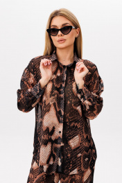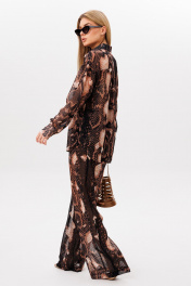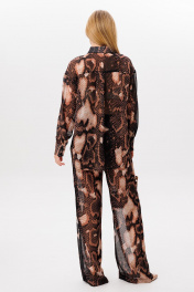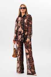 Блузка свободного силуэта, с центрально-бортовой застежкой по переду на петли пуговицы. Воротник отложной стойка. Спинка на кокетке. Рукав длинный на манжете. Брюки палаццо свободного кроя с притачным поясом на резинке.Брюки на подкладке.