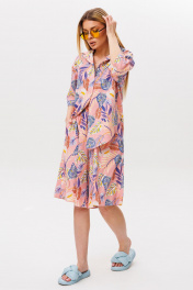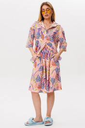 КОМПЛЕКТ ДВОЙКА. Рубашка свободного силуэта,с центрально бортовой застежкой на петли пуговицы.Воротник на стойке отложной.Спинка на кокетке,рукав короткий. Юбка шорты свободного силуэта с притачным поясом на резинке.