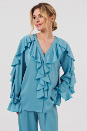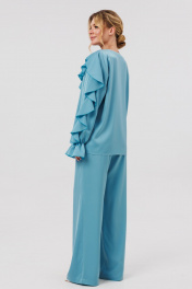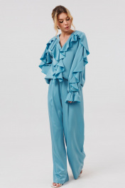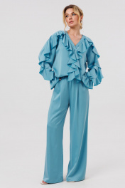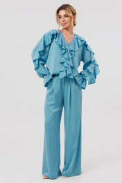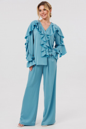 КОМПЛЕКТ ДВОЙКА. Блузка женская свободного силуэта с застежкой по переду на пуговицы. По переду блузки и по рукавам декоративные воланы. Брюки палаццо свободного кроя с притачным поясом на резинеке.В боковых швах карманы.