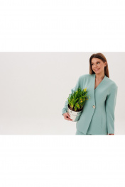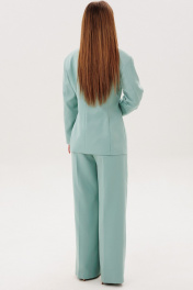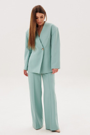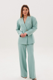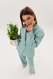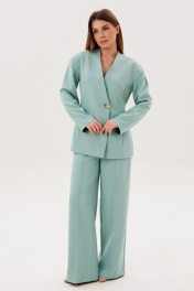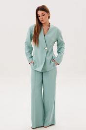 Костюм двухпредметный.Жакет полуприлегающего силуэта обладает спущенными плечами и V-образным вырезом, что добавляет образу изысканности. Функциональные детали включают подкладку, втачные длинные рукава и действующие карманы в рельефах по переду. Застежка на петлю-пуговицу . Спинка жакета оформлена средним швом и рельефами для идеальной посадки. Брюки прямого силуэта дополняют ансамбль, предлагая комфорт и свободу движений. Они оснащены притачным поясом и удобной застежкой на тесьму-молнию спереди. Боковые карманы подчёркивают функциональность брюк.
