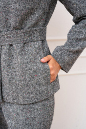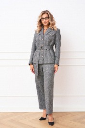 Костюм женский состоящий из жакета и прямых брюк, зауженных к низу. Жакет прямого силуэта с воротником пиджачного типа и центральной застежкой на петли и пуговицы. По полочке обработана кокетка, в шов которой вставлен отделочный клапан. В шве рельефа обработан карман. Рукав втачной, двухшовный. Спинка со средним швом и рельефами. Верхний срез обработан притачным поясом по задним половинкам для лучшей посадки вставлена резинка, застегивающийся на петлю и пуговицу, застёжка центральна с гульфиком и откоском на тесьму молнию, в боковых швах обработаны функциональные карманы с отрезным бочком. Костюм дополнен съёмным поясом из основной ткани застегивающийся на пряжку-протяжку. 48 50 52 54 56 Обхват груди 96 100 104 108 112 Обхват бедер 104 108 112 116 120 Рост 170 170 170 170 170 Длина спинки 66 66 66 66 66 +/- 1см. Ширина спинки 39 39 43 43 43 +/- 1см. Ширина уровне глубины проймы 106 110 114 118 122 +/- 1см. Ширина на уровне линии бедра 110 114 118 122 126 +/- 1см. Ширина по линии талии 104 108 112 116 120 +/- 1см. Ширина в низу 114 118 122 126 130 +/- 1см Длина рукава 62 62 62 62 62 +/- 1см. Ширина рукава в веху 36 38 40 42 44 +/- 1см. Ширина рукава в низу 14 14 16 16 16 +/- 1см. Длина брюк по боковому шву 103 103 103 103 103 +/- 1см. Ширина брюк по линии бедер 108 112 116 120 124 +/- 1см. Ширина брюк по талии без резинки 82 86 90 94 98 +/- 1см. Ширина брюк по талии с учетом резинки 74 78 82 86 90 +/- 1см. Ширина брюк внизу изделия 40 42 44 46 48 +/- 1см. Ширина пояса 4 4 4 4 4 +/- 1см Ширина брюк на уровне колена 54 56 58 60 62 +/- 1см. Длина брюк по шаговому шву 76 76 76 76 76 +/- 1см.