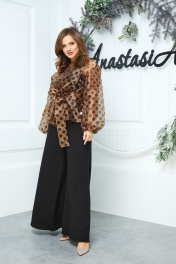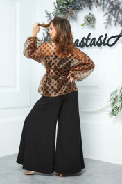 Туника женская прямого силуэта из органзы в горохи со спущенной линией плеча. С ее помощью легко можно трансформировать повседневный образ в праздничный. Идеально сочетается с брюками , юбкой , платьем. Рукав двойной, расширенный к низу со складками. По спинке и полочке идет планка. В комплекте с туникой идет съемный пояс. Длина спинки(48-56)-66 см. Длина рукава: (48-56)-53см.