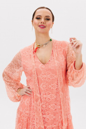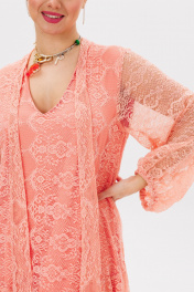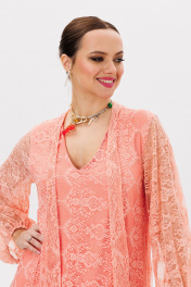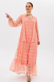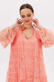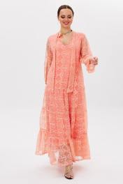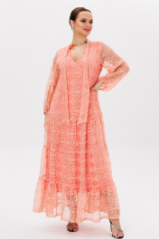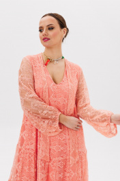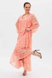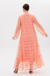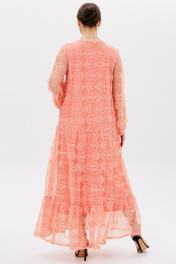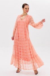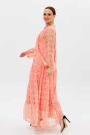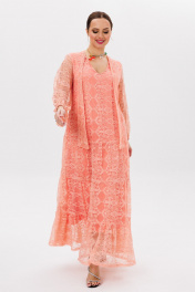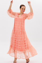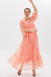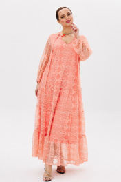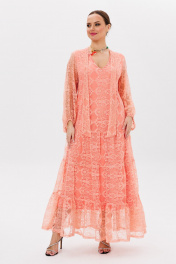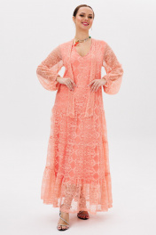 Вечернее платье макси из кружевного полотна, на подкладке, трапециевидного силуэта — дополнение любого образа. Отличный вариан на любое торжество. По горловине V-образный вырез и стойка переходящая в бант. Рукав расширенный к низу, на резинке, фигурный. По полочке и спинке идут 3 присобранных волана. Длина платья (по спинке):(50-54) 134см. Длина рукава: (50-60)-56см.