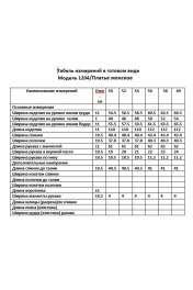 Платье выполнено из двух видов ткани, однотонной ткани и ткани с набивным принтом. Верхняя часть платья-лиф выполнена из ткани с принтом. Полочка с двубортной застежкой на запах. Застежка на потайную пуговицу с правой стороны и завязывающийся пояс с левой стороны. Полочка на подкладке со складками по линии талии. Воротник рубашечного типа на стойке. Спинка цельная, со складками по линии талии. Рукав втачной, одношовный, длинный. По низу рукава со сборкой и на притачной манжете с застежкой на петли и пуговицы. Юбка платья выполнена из однотона. Передняя часть юбки с ассиметричным низом, с отлетным бортом на запах. По линии талии обработаны талиевые вытачки. На задней половинке юбки обработаны талиевые вытачки. Платье длиной за колено.