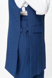 Костюм состоит из жилета и брюк. Костюм выполнен из однотонной ткани, жилет на подкладке. Жилет прямого силуэта, удлиненный. Полочка жилета с центральной застежкой на петли и пуговицы, вертикальными рельефами и прорезными карманами с клапанами. Горловина V-образной формы с отложными лацканами и воротником пиджачного типа. Спинка со средним швом. В боковых швах выполнен декоративный элемент в виде металлических колец крепящихся на петлях. Брюки классические, длиной до косточки, со стрелками. Брюки прилегающие в области бедер и свободные в колене и по низу. По передним половинкам выполнены наклонные карманы, в среднем шве обработана застежка на молнию. По задним половинкам обработаны талиевые вытачки. Брюки на притачном поясе с эластичной тесьмой и застежкой на петлю и пуговицу.
