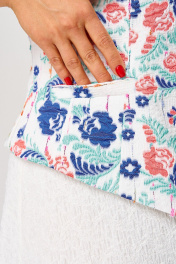 Костюм состоит из жилета и юбки. Костюм на подкладке. Жилет полуприлегающего силуэта, выполнен из жаккардовой купонной ткани. Полочка жилета с вертикальными рельефами и прорезным карманом с листочкой. Горловина V-образной формы. Спинка со средним швом и вертикальными рельефами. Юбка А-образного силуэта, выполнена из однотонной ткани “жатка”. Юбка на притачном поясе с эластичной тесьмой и застежкой на петлю и пуговицу. В левом боковом шве обработана потайная молния.