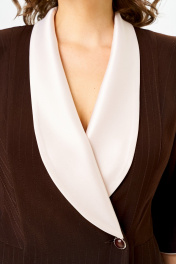 Платье полуприлегающего силуэта, длиной за колено, выполнено из однотонной ткани, в качестве отделки использована контрастная по цвету ткань с легким атласным эффектом. Полочка платья с вертикальными рельефами в верхней части и с отрезной боковой нижней частью, на которой выполнены карманы и складки в шве по талии. Застежка двубортная, на петлю и пуговицу. Горловина V-образной формы, обработана воротником типа “апаш” из отделочной ткани. Спинка со средним швом и вертикальными рельефами. Рукав длинной 3/4, втачной, двухшовный, с отделкой по краю.