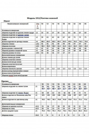 Костюм состоящий из жакета и брюк, выполнен из костюмной ткани в полоску. Жакет полуприлегающего силуэта, без подкладки. Полочка жакета с центральной застежкой на петли и пуговицы. Верхняя часть полочки с нагрудной вытачкой, нижняя часть отрезная с карманом и клапаном в шве. Горловина круглой формы, со стояче-отложным воротником. Спинка цельная. Рукав втачной, одношовный, длиной ¾. По низу рукав обработан притачной манжетой с декоративной застежкой на петлю и пуговицу. Низ жакета полочки ассиметричный. В нижней части боковых швов обработаны разрезы. Брюки классические, полной длины. В области бедер полуприлегающие, в колене и по низу прямые. По передним половинкам обработаны складки по линии талии и наклонные карманы. По задним половинкам обработаны талиевые вытачки. Брюки на притачном поясе с эластичной тесьмой и застежкой на петлю и пуговицу.