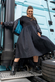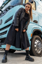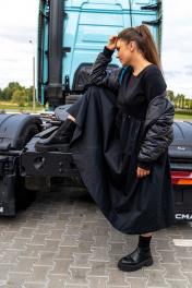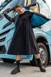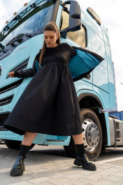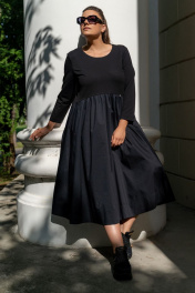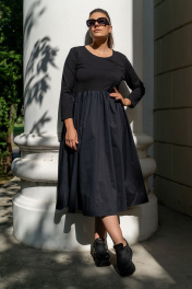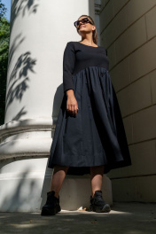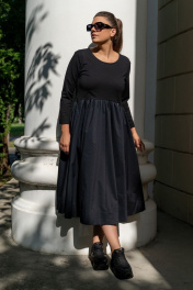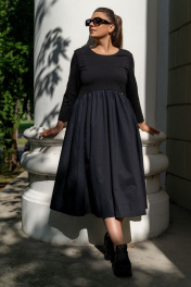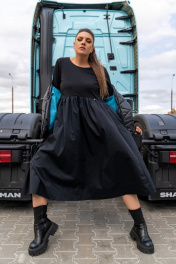 Платье женское очень модное, свободного покроя, верх платья трикотаж, юбка платья из хлопка. Платье со сборкой по талевому подрезу, в рельефных швах обработаны карманы. По переду подреза декоративное небольшое украшение.
