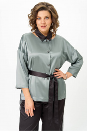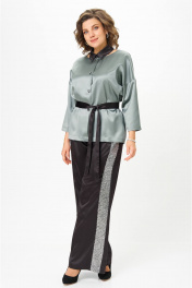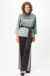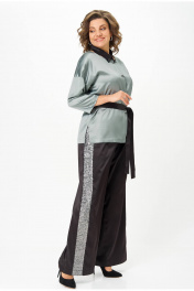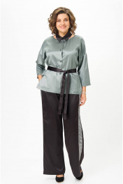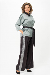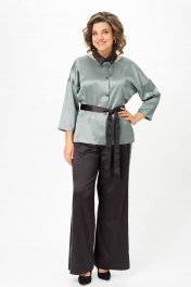 Комплект женский, состоит из блузки и брюк. Стильная атласная блузка со съёмным воротником и дизайнерскими пуговицами, способна сделать ваш гардероб еще более модным и уникальным. Модель с рукавом ¾, свободным прямым кроем и съёмным поясом подойдет для любой фигуры, подчеркнёт её достоинства и скроет недостатки. Брюки палаццо со вставками из пайеток смотрятся очень стильно и оригинально. Высокая посадка и резинка по талии обеспечат комфорт и удобство в носке, а прямые широкие штанины зрительно вытянут силуэт, подчеркнув достоинства фигуры.