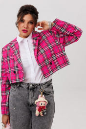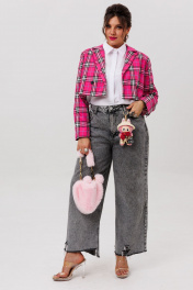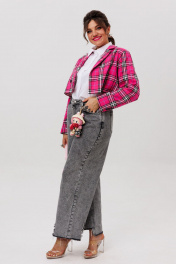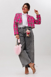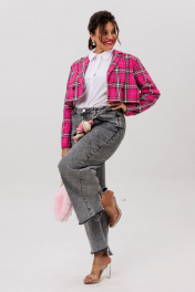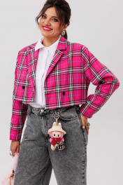 Этот укороченный двубортный жакет, словно созданный для тех, кто ценит баланс между классикой и современностью, идеально подчеркивает силуэт, добавляя образу лёгкую дерзость и безупречный стиль. Выполненный из благородной костюмной ткани в изысканную клетку, он сочетает в себе строгость кроя и игривость актуальных оттенков. Прямой силуэт с чёткими линиями подчёркивает женственность, не утяжеляя образ. Втачной двухшовный рукав со шлицей обеспечивает свободу движений, а отложной воротник с лацканами добавляет ноту элегантности. Завершает композицию шлица в среднем шве спинки — деталь, которая придаёт жакету динамику и лёгкость. «Сахарная вата» — нежно-розовый вариант в мелкую клетку, словно утренние лучи, мягко освещающие образ. Он идеален для романтичных, но уверенных образов: с высокими джинсами и лодочками, с плиссированной юбкой или даже поверх лёгкого платья. «Питахайя» — насыщенный, почти дерзкий оттенок фуксии, который превращает даже самый простой аутфит в заявление. Этот жакет — для тех, кто не боится выделяться. Наденьте его с чёрными кожаными брюками и босоножками на каблуке, и вы почувствуете, как обычный день превращается в выход в свет. Этот кроп-жакет от Анелли — не просто часть гардероба, а акцент, который делает любую вещь стильной. Он для тех, кто любит экспериментировать, но не жертвует комфортом. Для тех, кто хочет чувствовать себя уверенно — будь то офис, вечерний коктейль или прогулка по городу. С ним вы не просто одеваетесь — вы создаёте настроение. Замеры: Размер 44: ОГ-94; ОТ-92; ОП-36; ДИ-38; ДР-60; Размер 46: ОГ-98; ОТ-96; ОП-38; ДИ-40; ДР-60; Размер 48: ОГ-102; ОТ-100; ОП-40; ДИ-39; ДР-61; Размер 50: ОГ-106; ОТ-104; ОП-40; ДИ-39; ДР-61; Размер 52: ОГ-112; ОТ-110; ОП-40; ДИ-39; ДР-61;