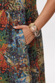 Платье от Анелли из благородного беларусского льна с гипнотическим принтом «калейдоскоп» рождает ощущение абсолютной гармонии и внутренней свободы. Мягкий свободный крой, в котором каждая женщина чувствует себя естественно и утончённо, дополнен V-образным вырезом горловины как на спинке, так и на полочке - этот приём создаёт изысканную линию, визуально удлиняющую силуэт и открывающую изящные ключицы. Особого внимания заслуживает конструкция: отрезная по линии талии, с деликатной сборкой, благодаря чему лён ложится мягкими волнами, не сковывая движений. Продуманный разрез по ноге добавляет лёгкости походке и делает образ более динамичным. В боковых швах устроены два кармана - неприметные снаружи, но такие необходимые внутри, чтобы сохранять ощущение уюта и практичности в любой момент. Подлинным украшением сарафана становится кокосовое кольцо - естественный, природный акцент, перекликающийся с фактурой беларусского льна и добавляющий нотку этнической эстетики. Это платье удивительным образом сочетает в себе повседневную непринуждённость и праздничную торжественность: в нём можно отправиться на утреннюю прогулку по городу или на летний вечерний приём, и в любой обстановке он будет смотреться органично и шикарно, оставаясь при этом безупречно удобным. Размер 54: ОГ-112; ОТ-112; ОБ-158; ДИ от плеча - 125; Размер 56: ОГ-117; ОТ-117; ОБ-164; ДИ от плеча - 125; Размер 58: ОГ-122; ОТ-122; ОБ-170; ДИ от плеча - 125; Размер 60: ОГ-127; ОТ-127; ОБ-176; ДИ от плеча - 126; Размер 62: ОГ-132; ОТ-132; ОБ-182; ДИ от плеча - 126;.