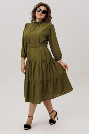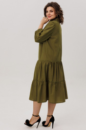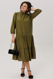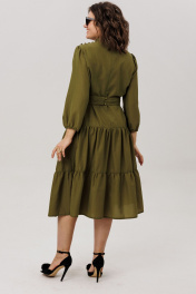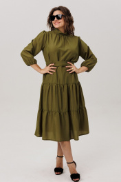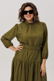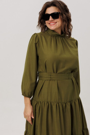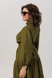 Свободный силуэт этого платья в цвете «испанская оливка» словно создан для городского ритма, придавая ярким будням лёгкость и особый шарм. Строгий воротник-стойка украшен изящной драпировкой и акцентой декоративной застёжкой на пуговки, что придаёт образу особую изысканность. От линии плеч ткань мягко собирается, образуя нежные складки, которые оживают с каждым движением. Укороченные рукава с аккуратными сборками подчёркивают линию плеча, а два ряда воздушных воланов от бёдер создают лёгкий, летящий ритм. Завершает этот восхитительный образ съёмный пояс, драпированный в верхней части, - деталь, которая позволяет мгновенно менять настроение наряда от повседневной непринуждённости до торжественного шика.