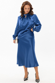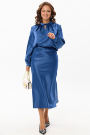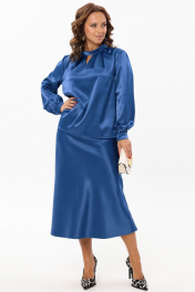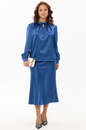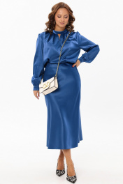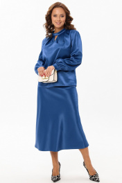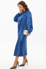 Нарядный женский комплект из гладкой ткани с атласной структурой украсит вас на любом праздничном или торжественном мероприятии. Блузка прямого силуэта. Горловина обработана отложным воротником-стойкой, по переду расположены симметричные складки и декоративная капелька, по спинке с застежкой на навесную петлю и пуговицу. Спинка со средним швом. Рукав втачной прямой длинный, по низу со сборкой и манжетой с застежкой на петлю и пуговицу. Юбка на резинке, трапециевидного силуэта с высокой талией. Французская длина и крой по косой создаст элегантный силуэт и подчеркнет фигуру. Длина блузки: 61 см Длина рукава: 62 см Длина юбки: 86 см