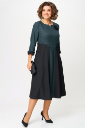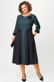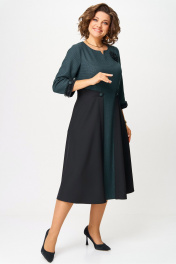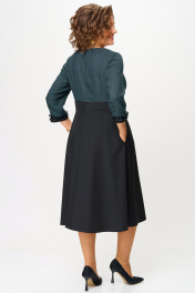 Лаконичное женское платье из двух видов ткани – просто находка для базового демисезонного гардероба. Благодаря крою, платье прекрасно садится по фигуре, выгодно подчеркивая ее достоинства и скрывая недостатки. Платье полуприлегающего силуэта, отрезное по линии талии. Горловина с фигурным вырезом, обработана обтачкой. По переду лифа — рельефные швы. По спинке лифа талиевые вытачки и средний шов, в котором обработана потайная молния. Юбка платья "клеш", с вертикальной вставкой по переду и средним швом по спинке. Подрез по талии закрывается декоративным поясом с пуговицами. Добавят комфорта при носке функциональные карманы в боковых швах. Рукав втачной прямой, длиной ¾, по низу — манжет, декорированный тесьмой и пуговицой. В комплекте к платью прилагается съемное украшение из тесьмы. Длина платья: 118 см Длина рукава: 43 см