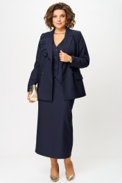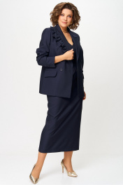 Модный юбочный комплект-тройка — прекрасный вариант на все случаи жизни, подойдет для работы и деловых встреч, а также для торжественных мероприятий. Жакет прямого силуэта, на подкладке, с плечевыми накладками. По переду — центральная двубортная застежка на петли и пуговицы, нагрудные вытачки и функциональные прорезные карманы с клапаном. Полочку жакета украшает съемная (на пуговицах) декоративная рюша с кружевом. Спинка со средним швом. Рукав втачной длинный двухшовный, с имитацией шлицы, декорированной пуговицами. Жилет прилегающего силуэта с центральной бортовой застежкой на петли и пуговицы, на подкладке. Вырез горловины V-образной формы. Перед — с талиевыми вытачками и прорезными карманами с листочкой. Спинка со средним швом и талиевыми вытачками. Прямая женская юбка с высокой посадкой длиной ниже колена, на подкладке. Верх на широком притачном поясе со вставками эластичной тесьмы. Застежка на молнию в среднем шве. На переднем полотнище вытачки, на заднем — вытачки и шлица в среднем шве. Длина жакета: 73 см Длина рукава: 62 см Длина жилета: 52 см Длина юбки (с поясом): 81 см