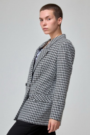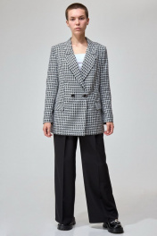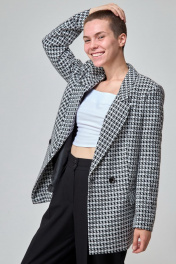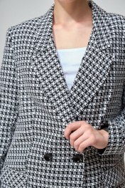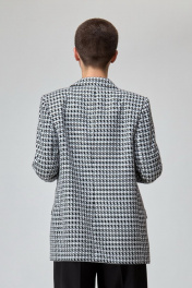 Эффектный удлиненный жакет с принтом "гусиная лапка" является неотъемлемой частью гардероба любительниц стиля casual. Такой жакет подчеркнет элегантность и женственность своей обладательницы, идеален для повседневной носки и отлично дополнит вечерний наряд. Жакет прямого силуэта, длиной ниже линии бедра, на подкладке, с плечевыми накладками, с двубортной застежкой на петли и пуговицы. Воротник пиджачного типа с отложными лацканами. Перед с талиевыми вытачкам и подрезными бочками, переходящими на спинку, с прорезными карманами в рамку с клапаном. Спинка с средним швом. Рукав втачной двухшовный длинный. Длина жакета: 72 см Длина рукава: 60 см