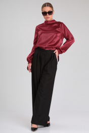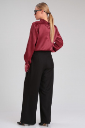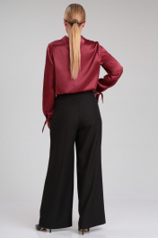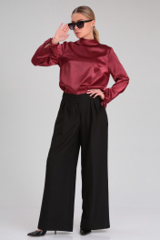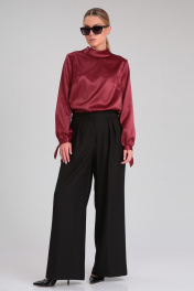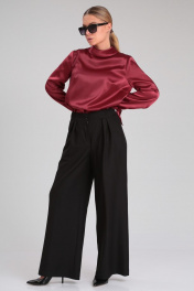 Стильный брючный комплект, состоящий из эффектной блузки и черных брюк-палаццо, идеально подойдет для любого торжественного мероприятия, а также для офиса и работы. Блузка прямого силуэта из гладкой однотонной ткани с атласной структурой. Воротник стояче-отложной с застежкой на навесную петлю и пуговицу по спинке. Перед с нагрудными вытачками. Спика со средним швом. Рукав втачной прямой длинный. По низу рукава сборка и узкая манжета с завязками, которые придадут игривость и изысканность Вашему образу. Брюки широкие длинные, с заутюженными стрелками, с высокой посадкой. На передних половинках складки. Пояс притачной с застежкой на молнию, петли и пуговицы, со вставками эластичной тесьмы по бокам. В боковых швах расположены карманы с косым входом. Длина блузки: 60 см Длина рукава: 61 см Длина брюк (с поясом): 106 см