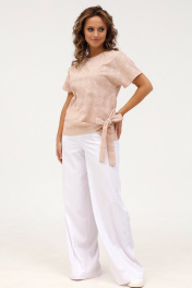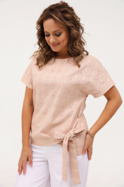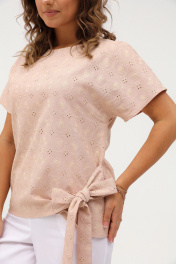 Легкая блузка из хлопкового шитья внесет романтичное настроение в повседневные летние образы. Позволит почувствовать себя женственной и стильной. Натуральный материал позволит телу дышать даже в самые жаркие дни. Такая блузка является идеальным выбором на каждый день, для отпуска и работы. Блузка прямого силуэта. Горловина округлой формы, по спинке с застежкой на навесную петлю и пуговицу. В нижней части переда блузки - декоративные завязки. По спинке средний шов. Рукав короткий цельнокроеный. Длина блузки: 60 см. Длина рукава от горловины: 29 см.
