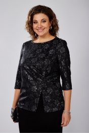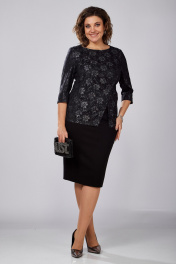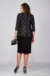 Костюм женский двухпредметный, состоит из блузки полуприлегающего силуэта и юбки. Костюм предназначен для повседневной носки и для торжественных случаев. Блузка застегивается на потайную тесьму-молнию в среднем шве спинки. Перед со складками и разрезом на левой стороне. Между складок вставлена декоративная деталь с 2 пуговицами. Спинка блузки со средним швом и талиевыми вытачками. Рукава втачные двухшовные укороченные. Юбка на бедрах, прямого силуэта, длиной до коленей, с притачным поясом. Юбка застегивается на потайную тесьму-молнию в среднем шве заднего полотнища. На переднем и заднем полотнищах по две вытачки с правой и левой стороны. В среднем шве заднего полотнища обработана шлица.