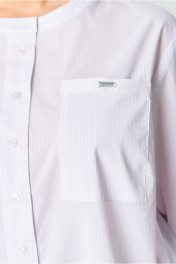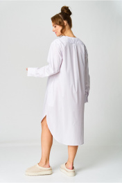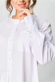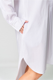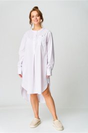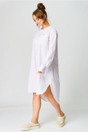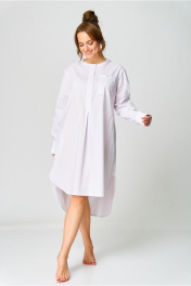Платье -туника из х\б ткани , для повседневной носки и дома . Длина с переди чуть выше колен , сзади длина доходит до икры . Центральная планка спереди застегивается на петли пуговицы . Рукав втачной , слегка спущен , с манжетами застегивающимися на петли пуговицы .