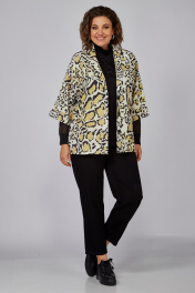 Жакет полуприлегающего силуэта, длиной до линии бедер с цельнокроеными рукавами. Жакет с центральной застежкой на три петли и пуговицы. Перед с боковыми прорезными карманами с листочкой. Спинка со средним швом. Рукава, укороченные с манжетой. Воротник пиджачного типа.