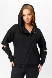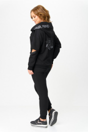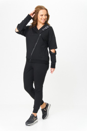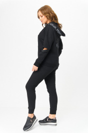 Костюм спортивный из мягкого трикотажного полотна , подходит для занятий спортом и для повседневной носки , а также уместен в любой неформальной обстановке . Костюм включает в себя толстовку и брюки . Толстовка свободная , прямого силуэта с застежкой " на запах " с металлической молнией и потайной кнопкой. С переди обработаны вертикальные прорезные карманы . По центру спинки принт . Полевой половине капюшона , так же идет принт . Рукава спущенные , длинные . По линии локтя на рукавах декоративные прорези . Низ изделия и рукавов обработан манжетами из кашкорсе . Брюки прилегающего силуэта с вертикальными прорезными карманами с переди и сзади . Верхний срез с приточным поясом из кашкорсе на резинке . Низ брюк также с приточными манжетами из кашкорсе .