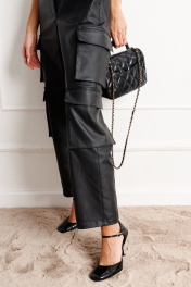 Брюки прямого кроя с акцентными карманами выполнены из искусственной кожи. Характеристики: прямой крой, пояс резинка со сборкой, в боковых швах карманы, по бокам крупные накладные карманы с клапаном. Длина 100 см