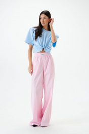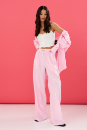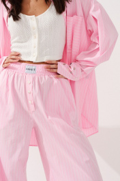 Брюки прямого кроя выполнены из розового хлопкового полотна с принтом вертикальная полоска. Характеристики: прямой крой, пояс на резинке, в боковых швах карманы. Длина 111 см. Образ дополнит рубашка артикул А912.