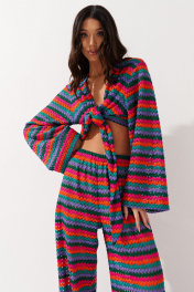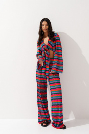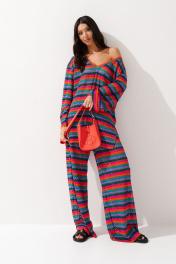 Брюки прямого кроя выполнены из фактурного полотна ажурной вязки разных ярких цветов. Характеристики: прямой крой, короткая подкладка, пояс на резинке. Длина 108 см. Образ дополнит джемпер артикул А 911, рубашка А915.