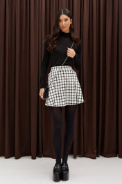 Юбка трапеция выполнена из полотна с черно-белым принтом. Харектеристики: силуэт трапеция, пояс стабильный с шлевками, скрытая застежка на молнии и крючках, декоративные складки, в боковых швах карманы. Длина 42 см.