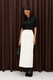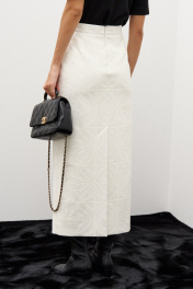 Юбка прямого кроя выполнена из экокожи белого цвета с вышивкой. По задней части изделия разрез. Харектеристики: прямой крой, пояс стабильный, на задней части изделия, по центру застежка на молнии.