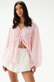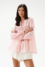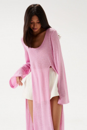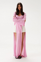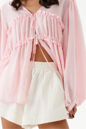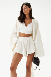 Шорты свободного кроя. Выполнены из хлопкового полотна белого цвета – муслин. Без подкладки. Пояс на резинке. В боковых швах карманы с отрезным бочком. По передней и задней частям вертикальные швы. По переду имитация застёжки. В боковых швах по низу разрезы (3 см). Длина по боковому шву 30 см. Шорты дополнит кардиган А2208