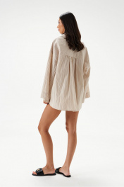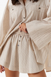 Шорты свободного кроя. Выполнены из хлопкового полотна песочного цвета в полоску. А-силуэт. Пояс на резинке. По передней части имитация застежки на 3 пуговицы. Карманы-хулиганы. По передней и задней части вертикальные швы. Длина 37 см