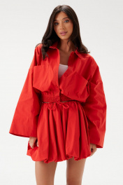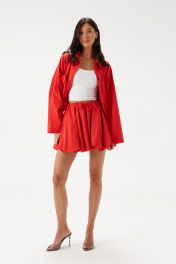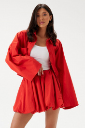 Юбка-баллон в длине мини. Выполнена из хлопкового полотна красного цвета. Пояс на резинке со шнурком. Есть подкладка. Длина изделия 40 см.