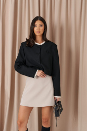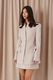 Юбка полуприлегающего силуэта выполнена из костюмной ткани светло-бежевого цвета. Характеристики: полуприлегающий силуэт, модель расширенна к низу, брендированный подклад. В среднем шве заднего полотна юбки обработана потайная застежка-молния. Пояс юбки обработан обтачкой. Длина изделия по боковому шву 41см.