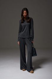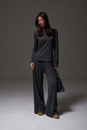 Брюки прямого, свободного кроя выполнены из трикотажного полотна графитового цвета. Характеристики: прямой крой, пояс на резинке, в боковых швах карманы. Длина брюк 107 см.