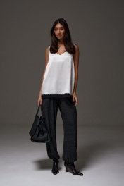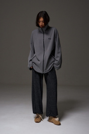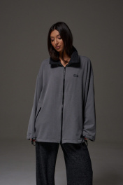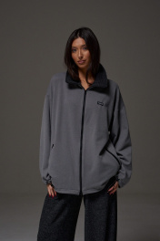 Брюки-джоггеры. Выполнены из мягкого ворсистого трикотажного полотна темно-серого цвета. Характеристики: прямой крой, пояс на шнурке-резинке с фиксатором, в боковых швах карманы, штанина внизу на резинке с фиксатором. Длина 1073см.