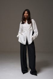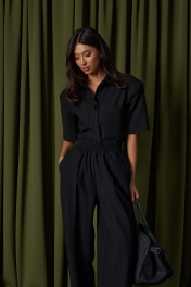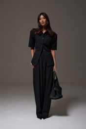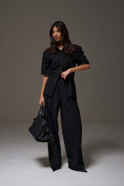 Брюки прямого кроя выполнены из костюмной ткани черного цвета. Характеристики: прямой крой, широкая резинка 7 см из основной ткани, боковые карманы, на передних и задних частях брюк заутюжены стрелки. Длина брюк 109 см.