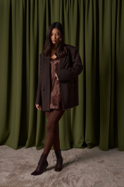 Юбка прямого кроя, выполнена из струящейся ткани коричневого цвета. Характеристики: прямой крой, на подкладке, пояс на резинке. Длина по боковому шву 42 см.