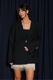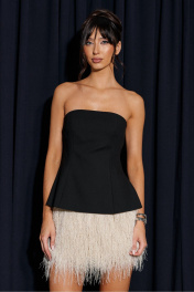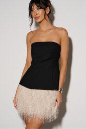 Юбка-мини, прямого кроя. Выполнена из полотна с длинным ворсом, кремового цвета с мелкими блестками. Пояс на резинке, есть подкладка. Длина 33 см